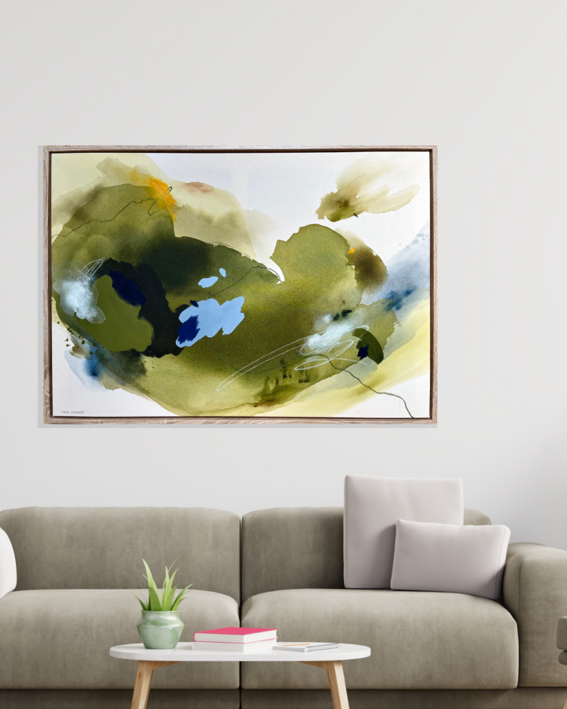 Das Kunstwerk ist wie erwartet in dezenten Grün-, Blau-, Braun- und Sandfarbtönen gehalten, mit fließenden Übergangen, ohne dabei zu kontrastreich zu wirken. Dadurch strahlt es für mich eine besondere Natürlichkeit aus, welche ich in diesem Bild unbedingt haben wollte.